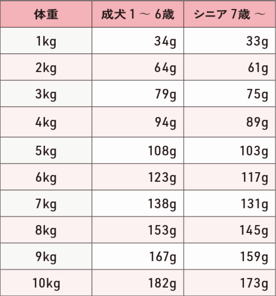 一般的なカロリー計算からの算出となるため、あくまで目安となります。 運動量や代謝などにより異なるため、体調や体重の変化に注意しながら調節してみてください。若い成犬で避妊・去勢されていない場合は、上記の給与量より約10%ほど多めに与えるのが目安となります。